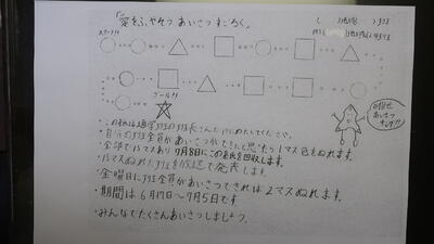 本校で目指す「あいのある学校」の姿として、挨拶を目標に掲げていることもあり、児童みんなの意識をもっと高めようと、生活委員の児童が「あいをふやそう あいさつすごろく」を企画してくれました。