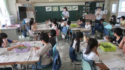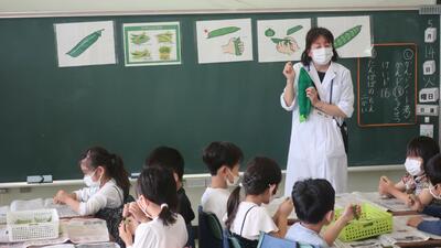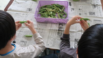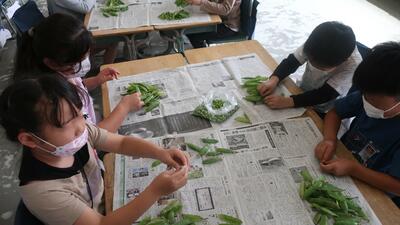 食育の一環で、グリーンピースのさやむき体験を行いました。