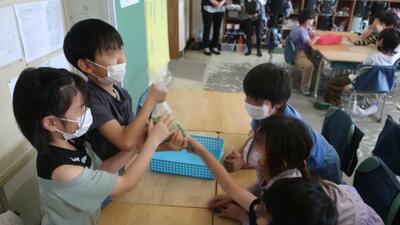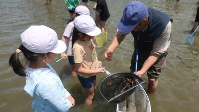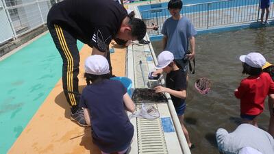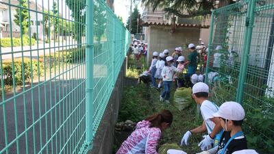プール清掃が行われる前に、3年生がプールにいるヤゴの救出をしてくれました。また川口市自然保護対策課から横山 隆 様をはじめ、職員の方をお招きし、環境講座を行っていただきました。