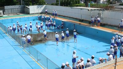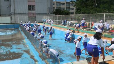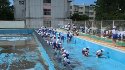 6月からのプールの授業に向け、5年生がプール掃除をしました。泥だらけだったプールが、見違えるようにきれいになりました。みんなが使うプールに愛情を注いでくれました。