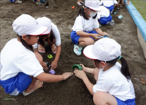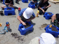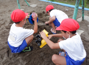 生活「なつとともだち」で、夏らしい遊びとして出た、砂遊び・水遊びを学年で行いました。当初、7月に行う予定でしたが、猛暑で実施ができず、2学期に入りようやく行うことができました。プラスチック容器や、おもちゃを持ち寄って全身で遊び、工夫したことをカードに書きました。