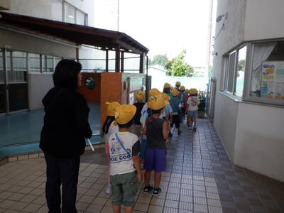 生活の学習で、通学路探検を行いました。自分たちの身を守るために道路に設置されているものや、110番の家、正しい道路の歩き方などを学習いたしました。途中、南平幼稚園に寄らせていただき、年長さんと交流をしました。