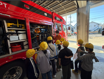 仮眠室など、消防署内の見学をするとともに、消防車の構造についても知ることができました。防火服については、実際に着てみると、とても重く、消防士の人たちの働きとその大変さを学ぶことができました。